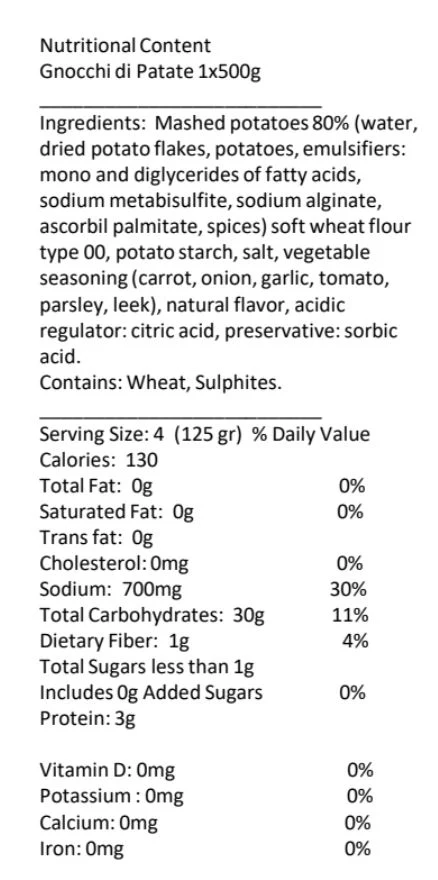 Potato flakes 80% ( water, dehydrated flake potatoes) 00 soft wheat flour, potato starch, salt, naturalĀ flavor, acidity regulator: citric acid, preservatives: sorbic acid.