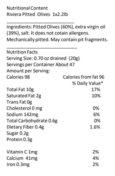 Pitted olives( 60%), extra Vergin olive oil (39%), salt. It does not contain allergens. Mechanically pitted, might contain pit fragments.